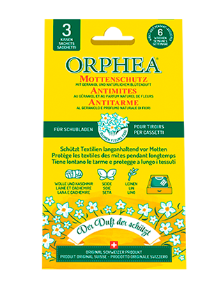 I sacchetti Orphea Salvalana sono realizzati in tessuto contenente granulato di mais 100% naturale e sono imbevuti nell’opificio svizzero del Canton Ticino. Il loro ricercato bouquet è frutto di una composizione a base di numerose fragranze estratte da piante e fiori, sapientemente dosate e miscelate per ottenere una fresca profumazione che avvolge e protegge a lungo i capi più preziosi (lana, lino, seta, cotone, ecc.) in modo gradevole. Ideali da usare all’interno di cassetti e scatole per la biancheria.
